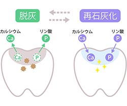 初期むし歯が普通のむし歯と違うところは、「自然に治ることがある」ということです。初期むし歯は「まだ穴が空いていない状態」なので、ミネラル分が失われたスカスカになった部分に唾液中のミネラル成分が再沈着すれば穴が空くのを防ぐことが可能なのです。