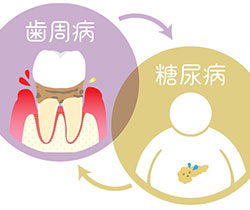 歯周病が起こっている状態では、歯茎の炎症により炎症物質が作り出されてそれが血管の中に入りこみます。この炎症物質は血糖を調節しているインシュリンの働きを妨げてしまい、血糖を下がりにくくし、糖尿病を発症させたり悪化させたりします。